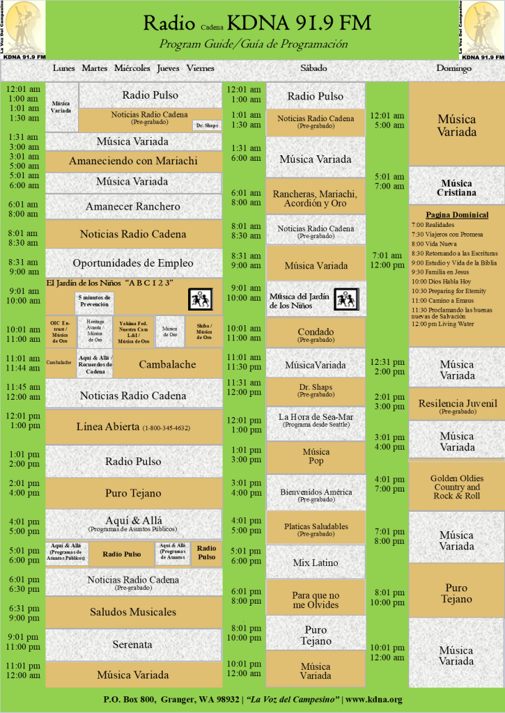 Radio KDNA strives to broadcast quality programming. From culturally relevant information that promotes community power to music that keeps us entertained, KDNA continues its focus on meeting the needs of our audience. See below for a schedule of our various programs.